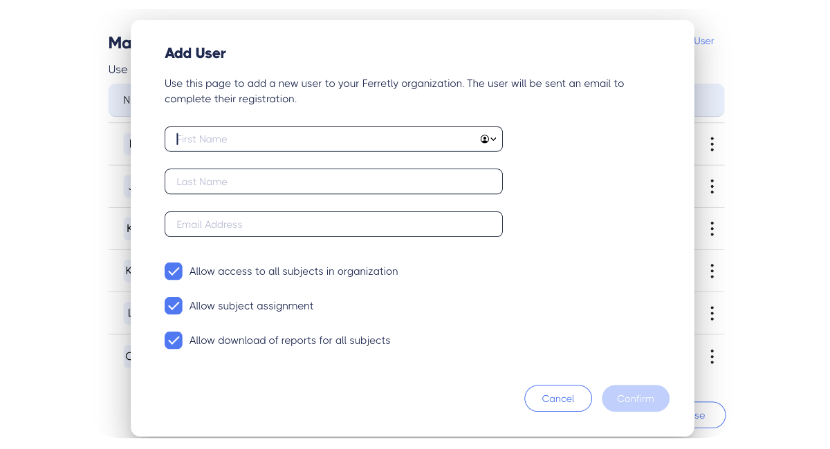 Allow subject assignment - Check the box to let users reassign subject ownership to other users. Uncheck if users must retain ownership of subjects they add to Ferretly.