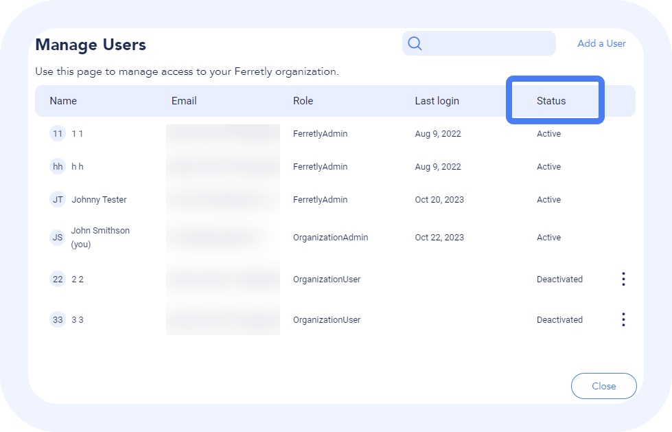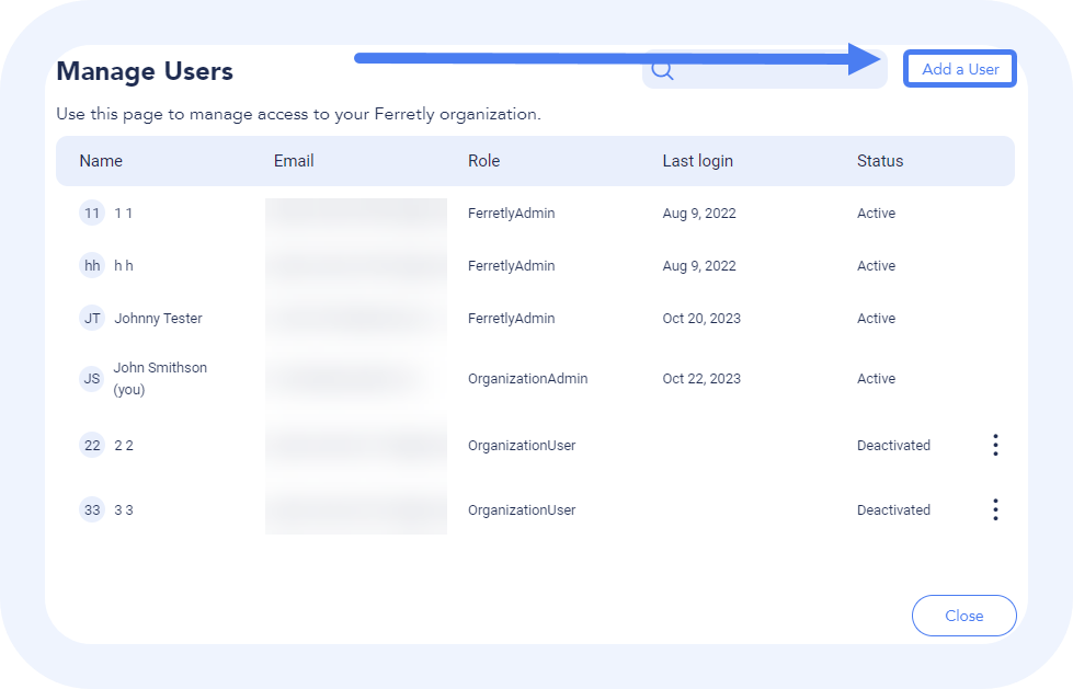 As an admin in Ferretly, you have the authority to create and manage users within your organization. This article will guide you through the process of adding a new user, defining their permissions, and monitoring their status.