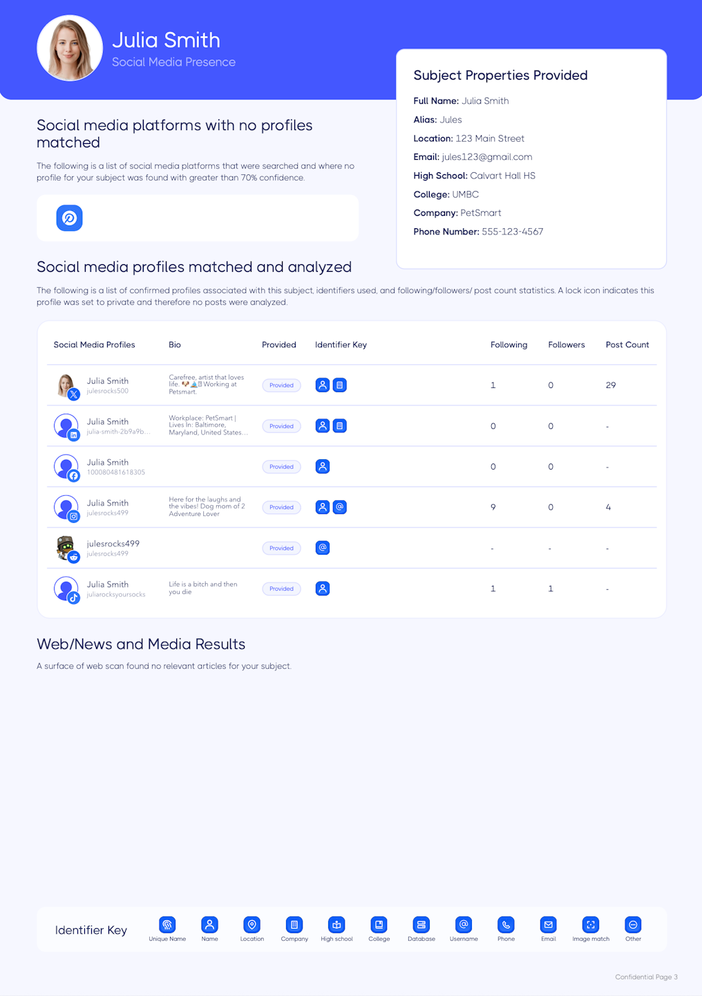 The social profiles page will show the subject properties provided, indicate the social media platforms searched and analyzed by Ferretly, and count of both web and news results. For each associated social media profile it includes the match criteria (identifiers) used.