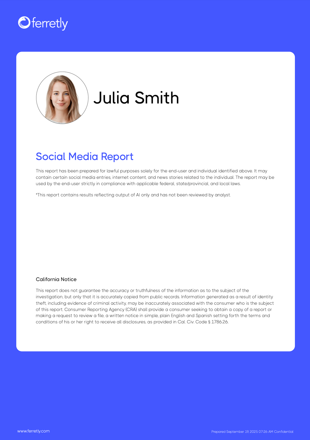 Includes full name and subject profile picture from one of their associated social media profiles. You will also see a disclaimer as to whether or not the report was reviewed by a human analyst. If FCRA setting or custom disclaimer was checked, a report addendum is included.