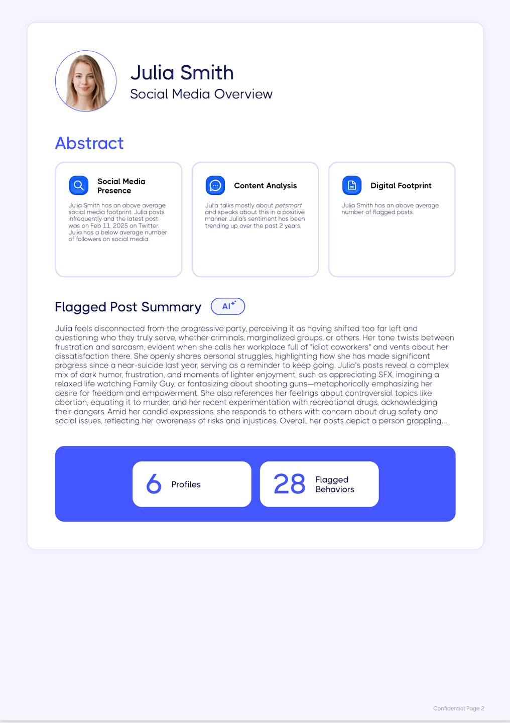 This optional page will provide an overview of the subject's social media presence including follower/following counts, post counts and frequency, sentiment trends, and what they discuss most often online. It will also include a count of their social media profiles, web/news posts, and flagged posts. Lastly, an AI generated flagged posts summary is included if the subject has original posts or replies that have been flagged.