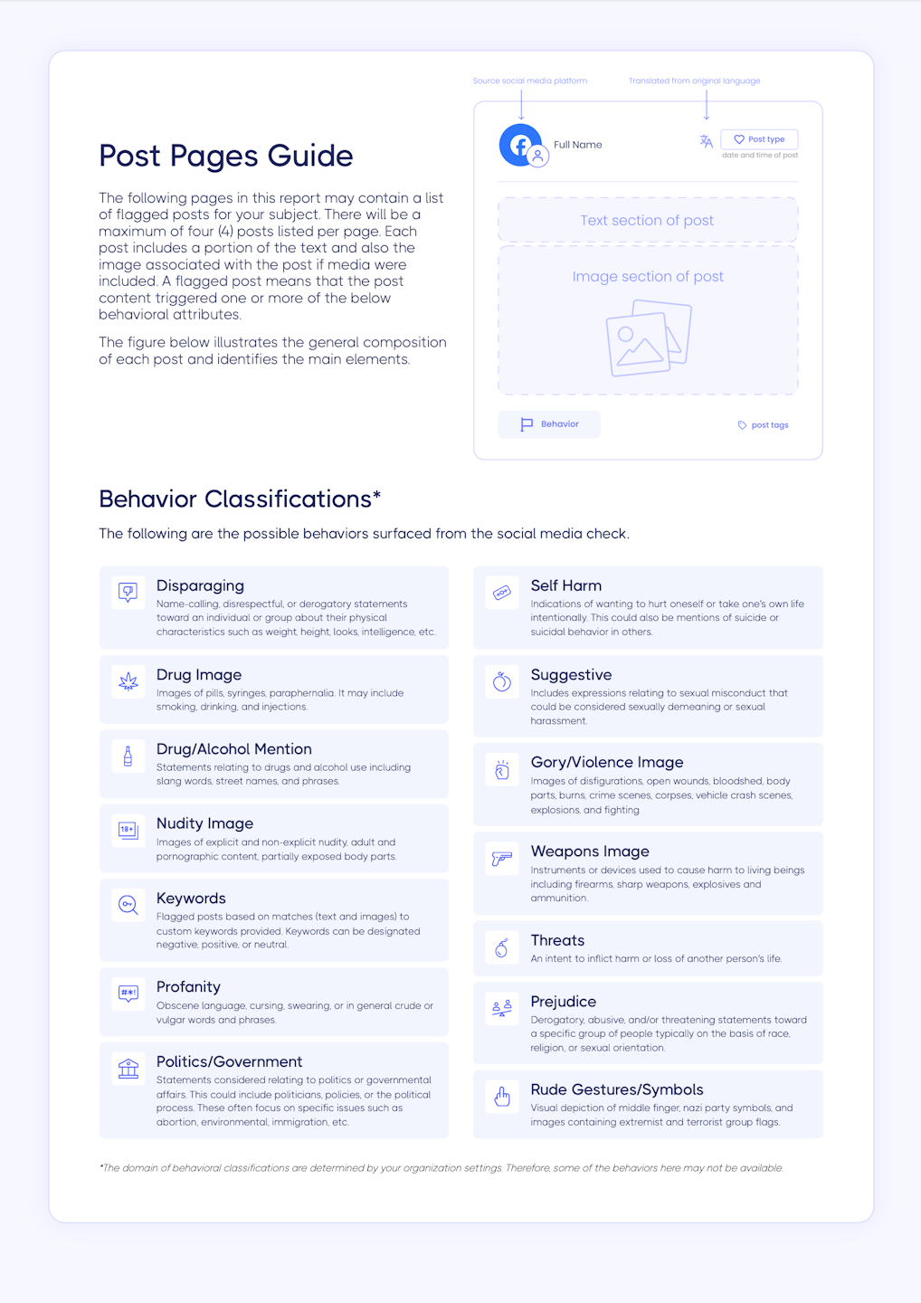 There are several main components which comprise the social media background report (social media report). What is included in your background report is largely driven by the profile settings used when the background check was performed and the background report settings.
