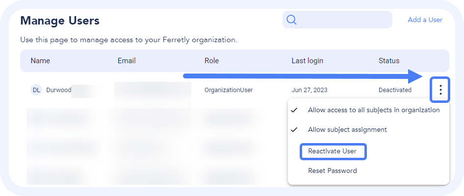 To allow a user access to Ferretly again, click the three dots and select Reactivate User