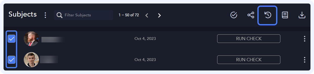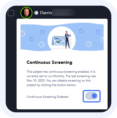 You can also hover over the subject profile picture and toggle the Continuous Screening Enabled switch. Moving the switch left means continuous screening is disabled.