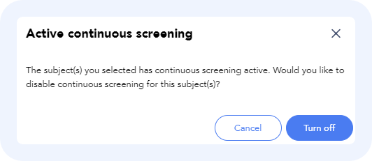 A Warning window will open. Click Turn Off to stop continuous screening for the selected subject(s).