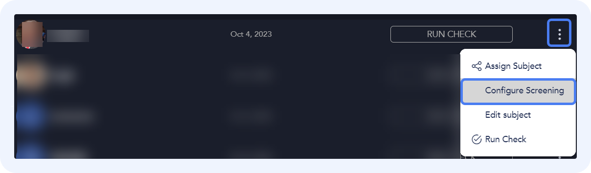 Click the three dots next to an individual profile and click Configure Screening or use the checkboxes to select multiple profiles and click the clock icon in the top right.