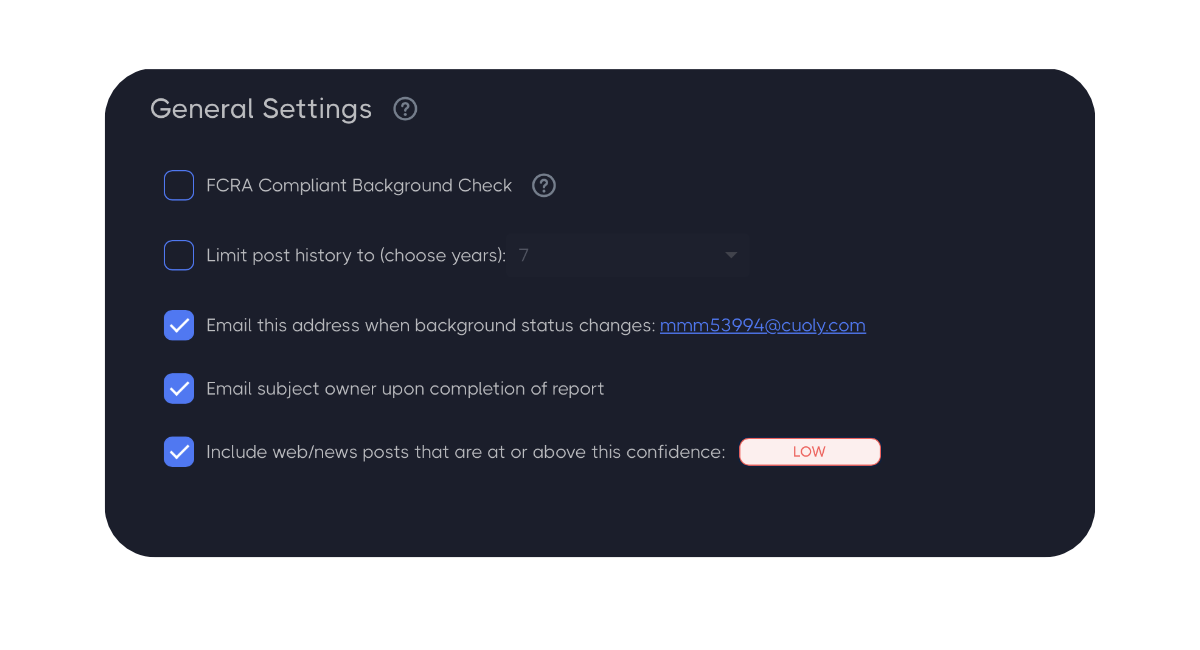 There are several options in General Settings to choose from. These include checking whether or not this report will be used for pre-employment purposes e.g., Fair Credit Reporting Act (in the US only), how many years of history you would like to analyze, where to send notifications regarding report status, and finally whether or not Ferretly should do a surface web scan for your subject.