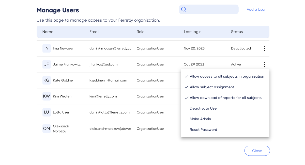 User permissions are an important part of Ferretly. You can select if users are able to assign subjects to others or view subjects added by others. You can also change a user role to an Admin, meaning they have access to manage new users, view billing information, and more.