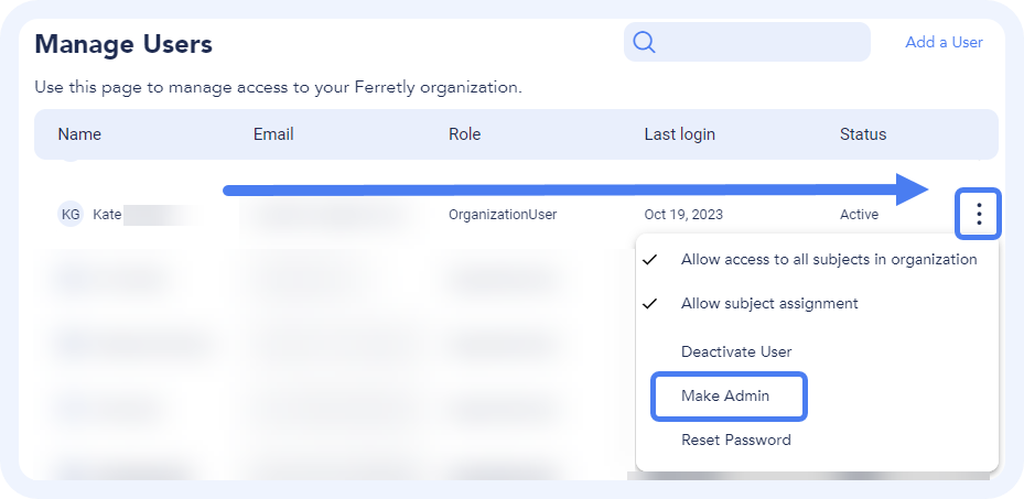 User permissions are an important part of Ferretly. You can select if users are able to assign subjects to others or view subjects added by others. You can also change a user role to an Admin, meaning they have access to manage new users, view billing information, and more.