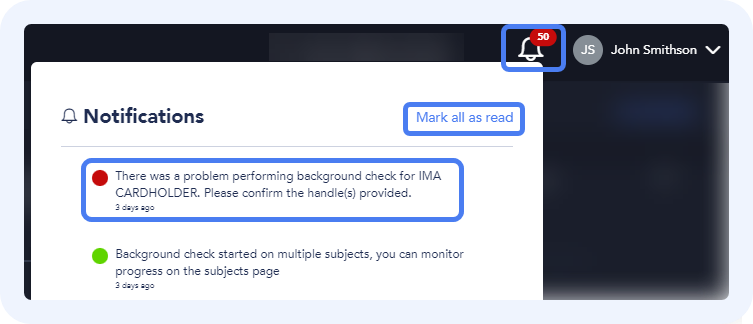 To view your notifications, click the bell icon in the top right. The dropdown will show the 50 most recent notifications on everything from a password change request to new background reports for your subjects.