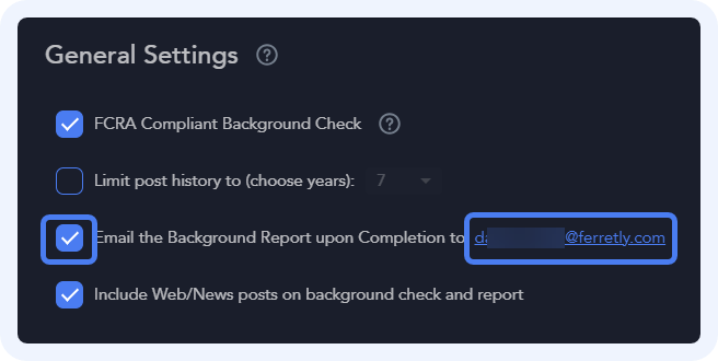 By default, when a background report is complete, you will receive an alert to the email address associated with your Ferretly account. You can change the email address that receives the alert, or turn the alert off altogether.