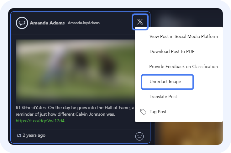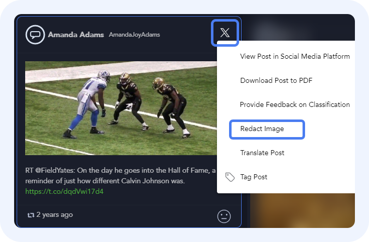 To redact an image, click the social media icon for the post in the top right corner. This might be a bird for twitter, camera for instagram, etc. select Redact Image in the dropdown.