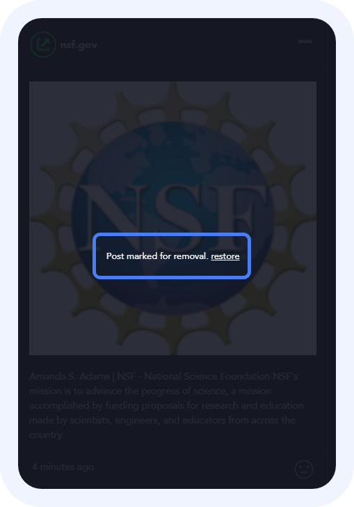 The post will have a notice that it is marked for removal. If you made a mistake, click Restore.