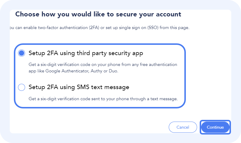 Setup 2FA using thirdparty security app - Get a six-digit verification code on your phone after signing up for and downloading any free authentication app like Google Authenticator, Authy or Duo.