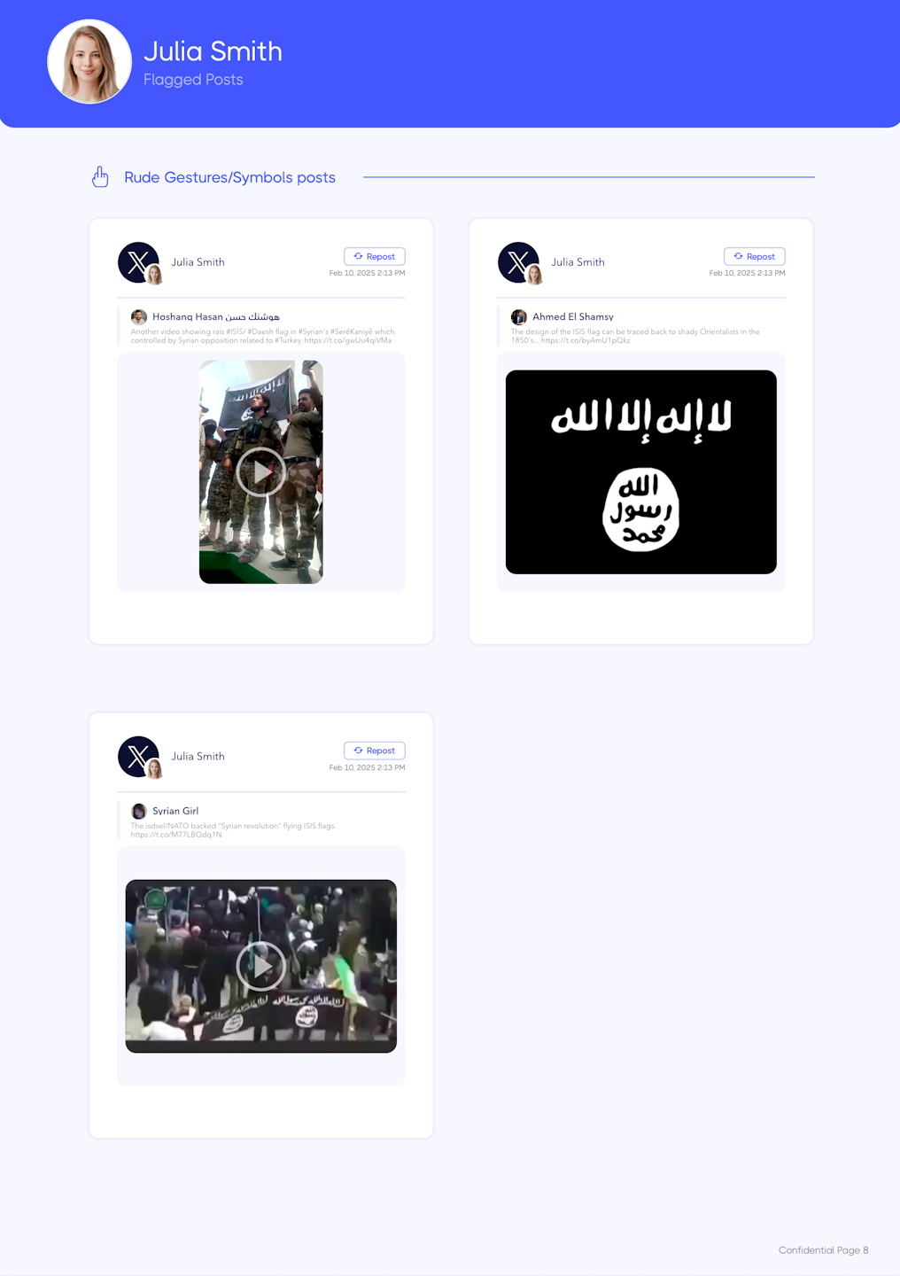 A list of flagged posts organized by post date chronologically (by default), with four posts per page. There can be two additional sections of flagged posts for keyword flagged posts and web/news posts. You can change how flagged posts are organized in report settings. Your choices are chronological, by platform, or by behavior.