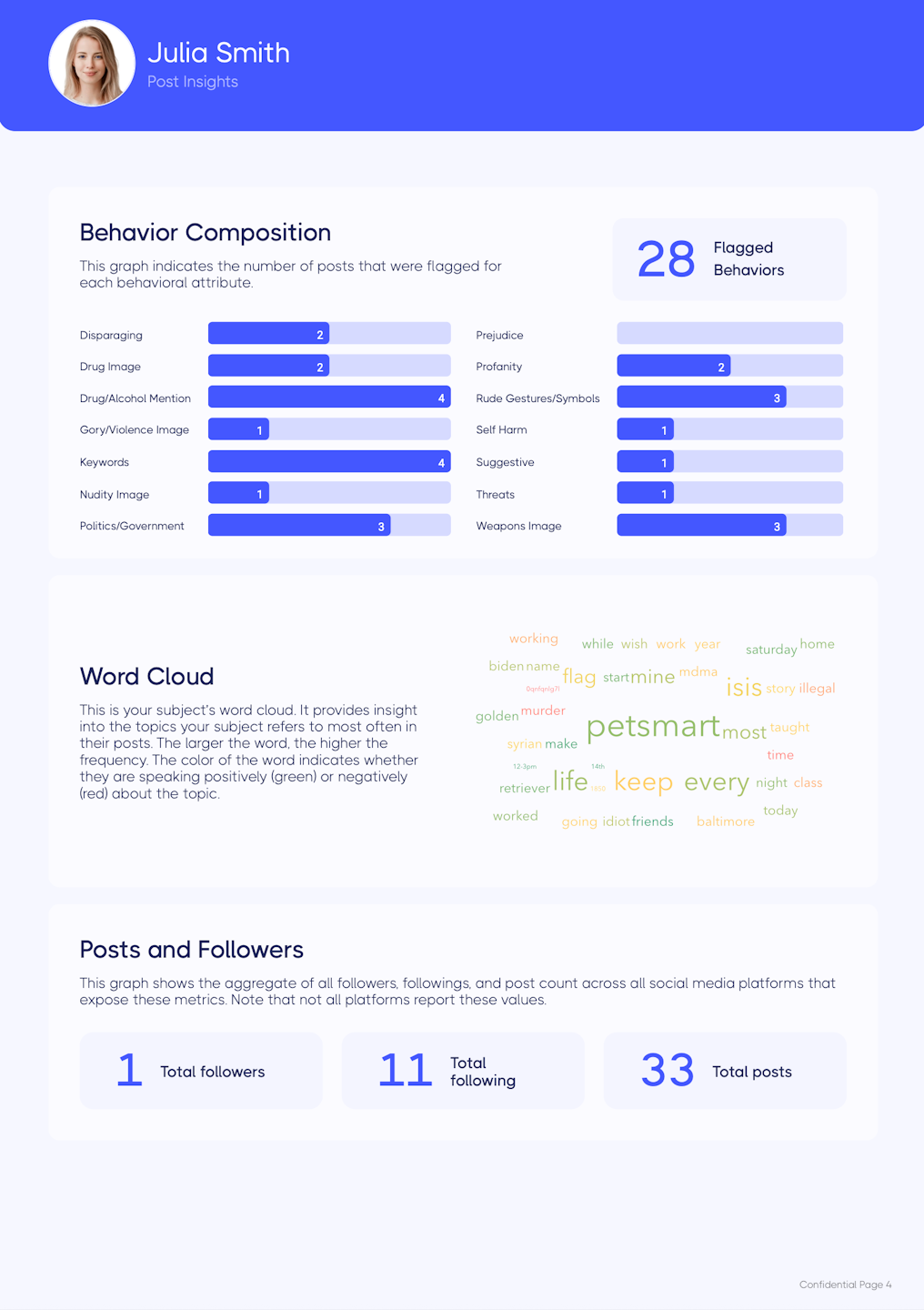 This optional page will provide an overview of the subject's social media presence including follower/following counts, post counts and frequency, sentiment trends, and what they discuss most often online. It will also include a count of their social media profiles, web/news posts, and flagged posts. Lastly, an AI generated flagged posts summary is included if the subject has original posts or replies that have been flagged.