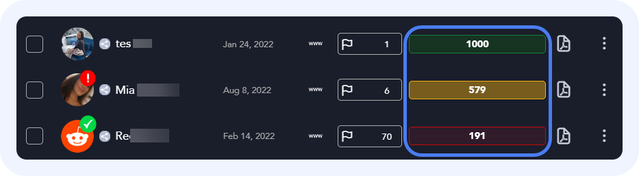 Scores show as a subject status and in subject reports. Scores are usually color coded with a solid background. Dark red indicates a low score, orange a medium score, and dark green a high score.