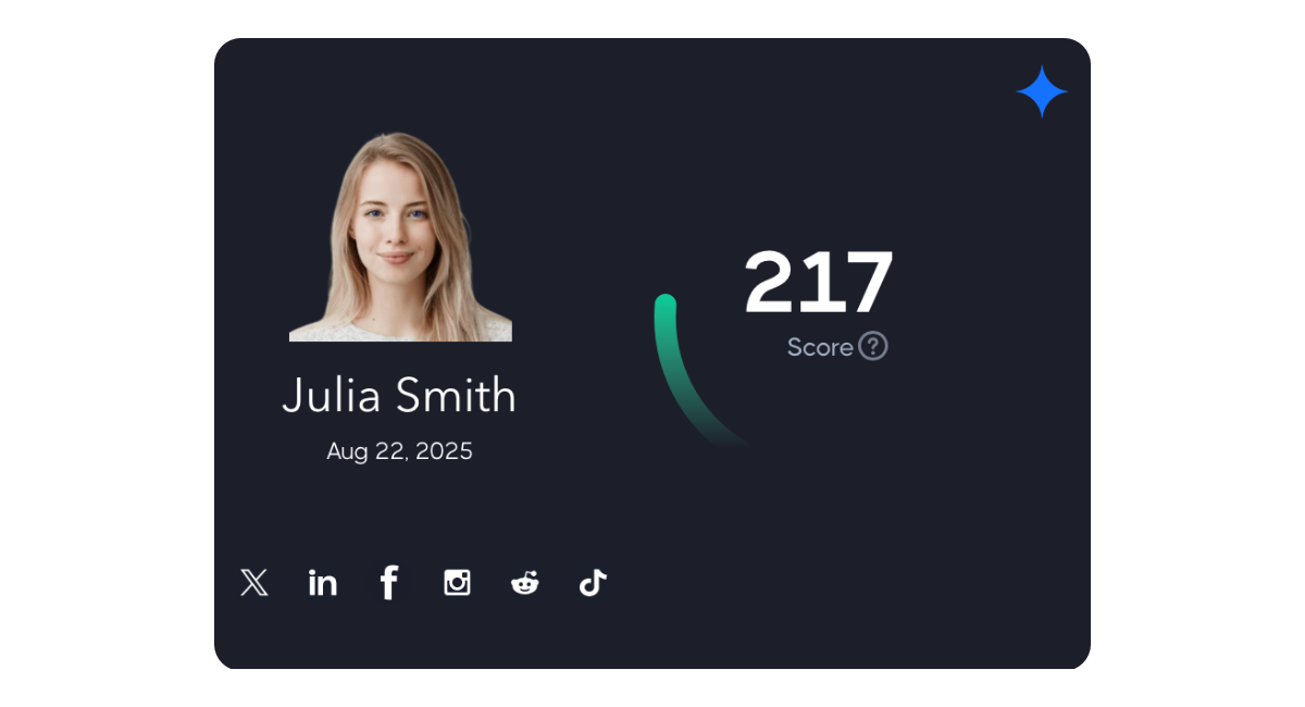 The top left card displays the subject's name, profile picture, date of the last social media report, and linked social media accounts. On the top right of the subject card, you can click the icon to display the flagged post summary.