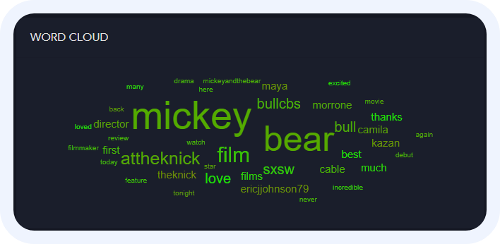 The word cloud visually represents the most frequently mentioned topics in the subject's posts. Larger words indicate higher frequency, and the color (green or red) indicates positive or negative sentiment respectively. Hovering over a word will magnify it.