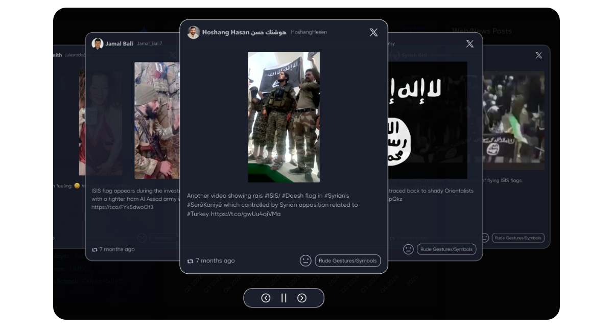 You can display the flagged posts for the subject by clicking the view posts link in the top right corner of the card. This will show the flagged posts in a carousel that automatically rotates through each. Or you can manually click through the posts by using the navigation arrows below. Click the X or hit ESC key to go back to the dashboard.