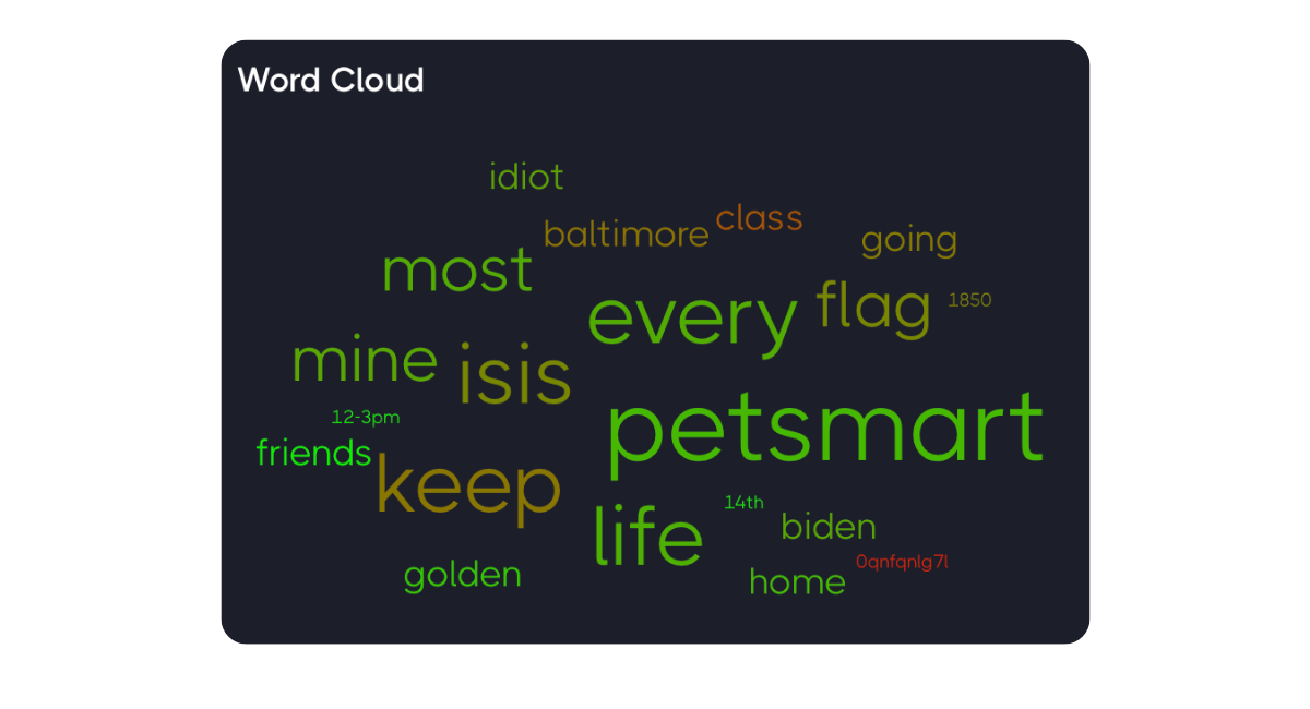 The word cloud is used to illustrate the word frequency of the subject's posts along with overall sentiment. The more frequent a word appears in the subject's post, the larger the word appears in the word cloud. In addition, sentiment is averaged across all posts containing the word. If a word appears more green in color, that implies the subject was using the word in posts which were more positive in tone.